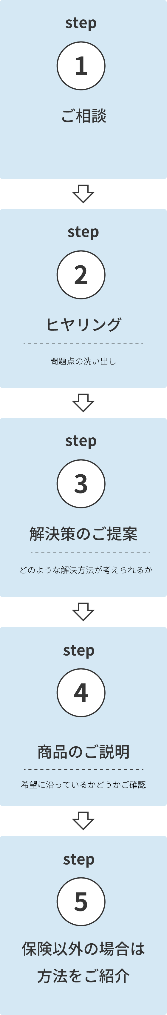 保険はあくまでも、選択肢の一つです。お客様の状況、目的次第では、別の方法をご提案する場合もあります。お客様との信頼関係をしっかりと構築しながら弊社の経験や知識をもとにお客様にとって考えうる最善のご提案をさせていただきます。