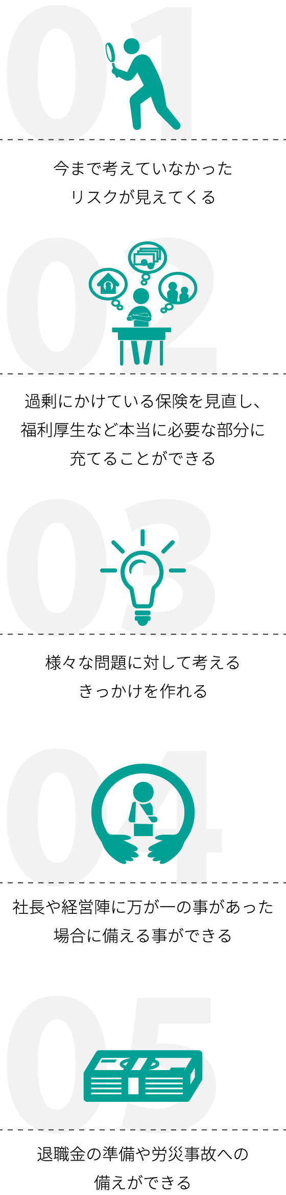 しっかりとしたヒヤリングと弊社の50年以上の代理店としての経験から、今まで考えていなかったリスク、役員・従業員の方が勤めやすいような福利厚生のご提案など、様々な問題に対して考えるきっかけを作ります。